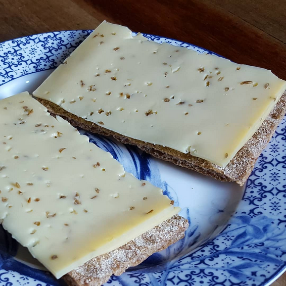 Indeed, when she walks into the living room, she sees Aunt Liesbeth at the table with a magazine. She holds a cup of tea, and in front of her is a cracker with cumin cheese on a small plate.