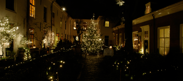 From the doorway, she takes in the oval-shaped square. The walls of the former almshouse rise up, tall and ghostly white. Behind the narrow, high windows, candlelight twinkles invitingly. In the centre of the garden, a fire basket burns. Around the garden, along the houses, dark figures move about, peering curiously into the dimly lit rooms at the beautifully decorated Christmas trees.