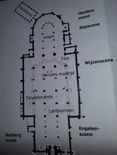 Na afloop is het nog te vroeg voor de kerstmaaltijd met de herders. Daarom lopen ze langs het devotiepad aan de rechterkant van de kerk om de beelden die tentoongesteld staan te bekijken en om de gedichten die erbij hangen te lezen. Om zes uur gaan ze terug naar de houten gymzaalbanken die zijn klaargezet in de ruimte tussen het koor en de grote kerk.
